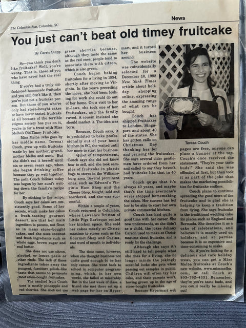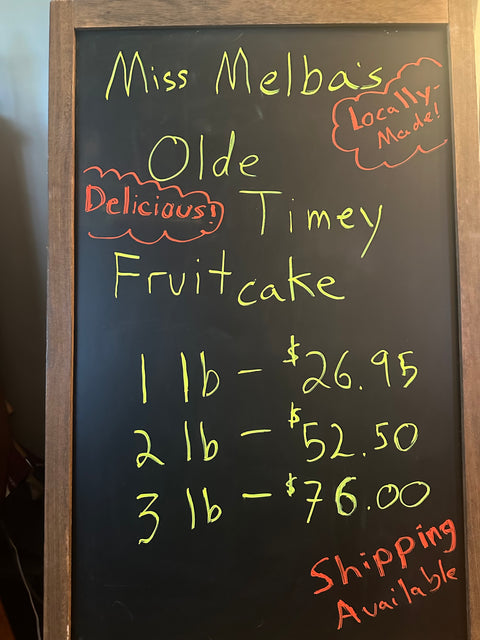 Miss Melba's Olde Timey Fruitcake is made with only the finest of ingredients.