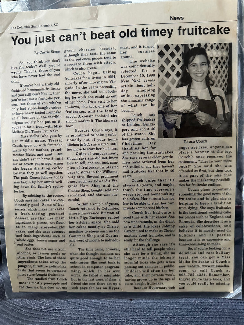 Miss Melba's Olde Timey Fruitcake is made with only the finest of ingredients: mouth-watering cherries, sweet pineapple, plump golden raisins, fresh coconut and only the choicest Southern pecans. All are hand-mixed and baked to produce a unique, rich and truly delicious fruitcake. Available in 1, 2 and 3 lb. sizes, my fruitcakes make excellent gifts for family, friends and corporate hospitality.